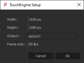 Frame rate: How many times per second TouchEngine updates its output. Higher values give smoother animation at the cost of GPU performance.