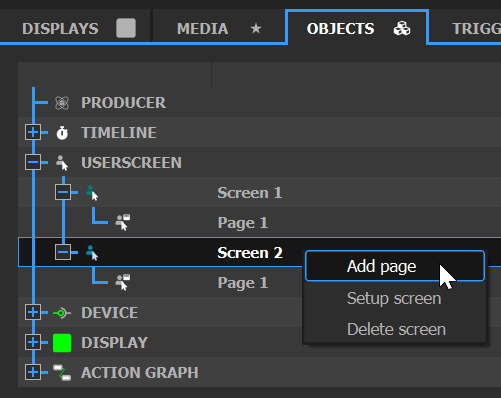 A show can contain several UserScreens; and each UserScreen can contain multiple Pages. This hierarchy is visible in the OBJECTS tab, and can be edited there: