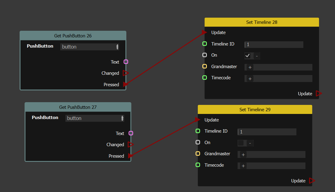 User interactions (like clicks on PushButtons and sliders) will be forwarded to Producer, and executed in the ActionGraph. For instance, the following graph will turn the 1rst Timeline on and off, depending on the pressed button: