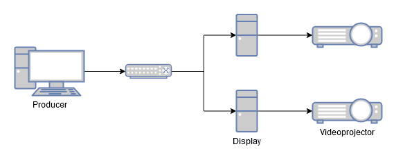 Producer should be connected to Media Servers via a switch; projectors should be connected to the Media Servers, for instance using a DisplayPort cable, depending on the projector.