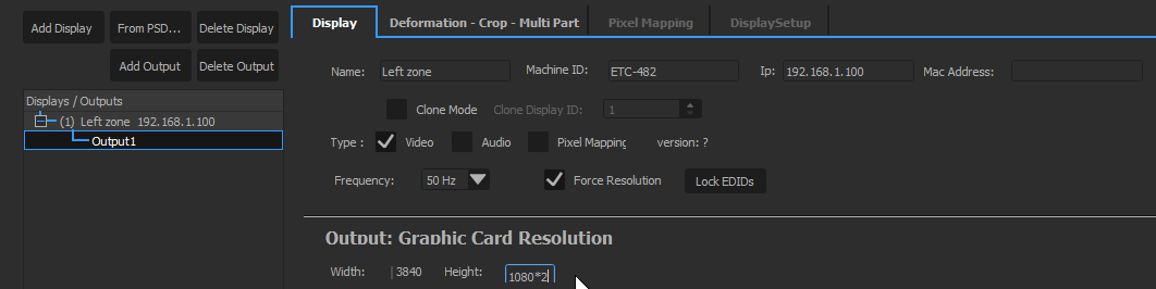 Go back in the Edit Media Servers dialog by double-clicking on Media Server Left, then in the Deformation tab, change the deformation mode to Deformation, and choose Keystone. You will then be able to warp the output image, and by adjusting the two projector this way, you should be able to create a single, aligned image.