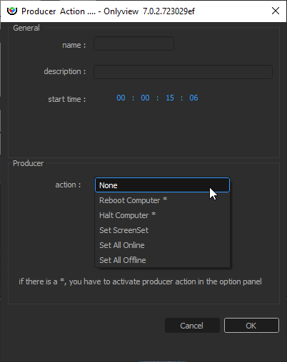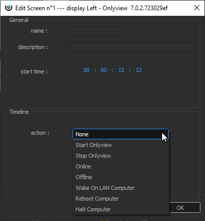 Wake On LAN: Sends a WOL packet to the Media Server computer. The BIOS must be configured to accept this; the Media Server’s MAC address must be exact in the Edit Media Server dialog (an easy way to do this is to Online the Media Server; this will update the MAC address). This command is usually followed by a 2-min gap in the timeline, followed by Start Onlyview and Online commands.
