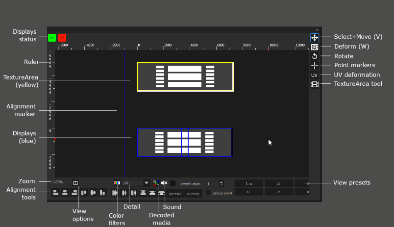 TextureAreas. Shows the TextureAreas names & resolutions; Dragging a TextureArea moves it; dragging a corner rescales it; A mouse drag on the background creates a new TextureArea.
