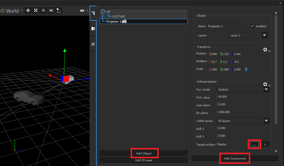 You need Videoprojectors to “capture” the scene on the Media Servers. To create a Videoprojector, click “Add Object”, then “Add component”, and select “Videoprojector”. The object can be manipulated in the 3D preview; position it approximately where it is in reality.